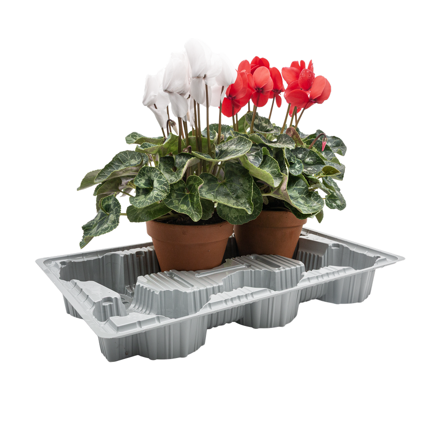 I portavasi in R-PET garantiscono la stessa capacità di carico dei portavasi in PS. La gamma comprende portavasi a riempimento o Shuttle e portavasi da trasporto.